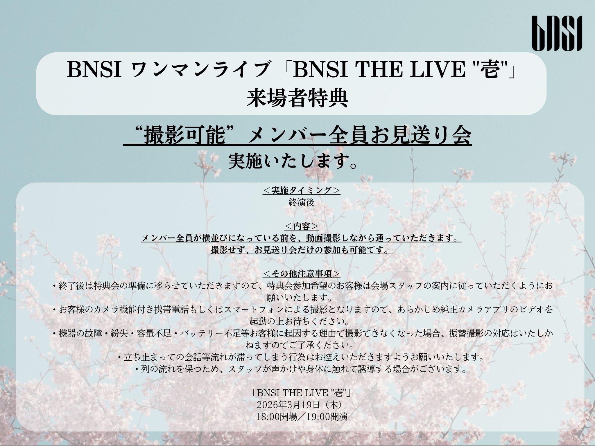 3月19日(木)に開催する「BNSI THE LIVE “壱”」におきまして、ご来場の皆様への来場者特典が決定いたしました!ご来場いただいた皆様に、˗ˏˋ “撮影可能”メンバー全員お見送り会ˊˎ˗